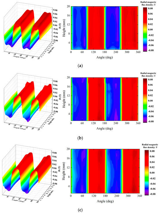 Figure 14a shows the Bs of the original magnet ring. It can be observed that the surface magnetic distribution is not uniform in the main magnetic region of each pole. The Bs is relatively high at both ends of the main magnetic zone, as the ends are more likely to form magnetic circuit closures with the adjacent poles. The resistance to forming a magnetic circuit closure in the middle of the main magnetic region is relatively high, thus creating a saddle position with relatively low apparent magnetic property. The distribution of the 3D surface flux density also explains why the Bs shows saddle waves in the results of the 2D FEM analysis. The value of Bs between the peak in the main magnetic area and the lowest in the saddle is 16.92%.
