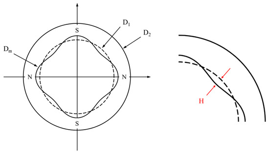 where Dm is the modified inner diameter, D1 is the inner diameter of the ordinary magnetic ring, H is the adjustment parameter, and p is the number of poles. As shown in Figure 19, the modified inner diameter selectively increases the thickness of the weak magnetic zones between the magnetic poles, while reducing the thickness of the main magnetic pole region to reduce the amount of bonded NdFeB used. The value of H needs to be optimized using the finite element method. An excessively large H value will affect the magnetic properties of the main magnetic pole.