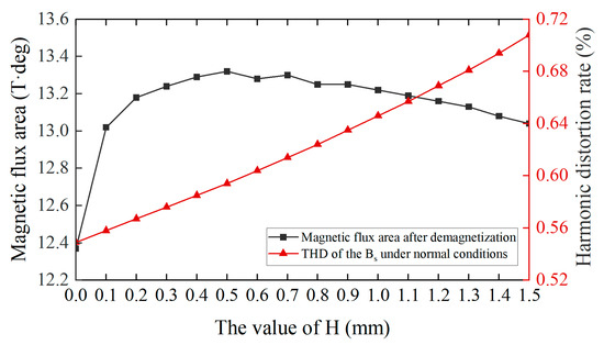 In this paper, we use parametric finite element simulation to determine the optimal value of H, which takes the value of 0–1.5 mm. As shown in Figure 20, the magnetic flux area after demagnetization of the magnet ring shows an increasing and then decreasing trend as the variable H increases. When H = 0.5 mm, the magnetic area after demagnetization of the magnet ring reaches its maximum value. As the parameter H increases, the THD of the Bs increases. An increase in harmonic content can lead to an increase in cogging torque, along with problems such as vibration noise. Therefore, we choose H = 0.5 mm for our analysis here.