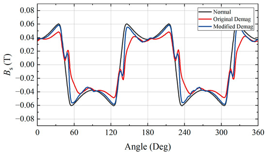 The demagnetized motor model was used for analyzing the surface radial magnetic flux density (Bs) and back EMF. Figure 8 shows the Bs for the normal case compared to the DMF case. When the overload causes partial demagnetization of the permanent magnet, the Bs and the EMF also decrease locally in the figure, presenting a local distribution consistent with the demagnetization case above. We use the magnetic flux area to measure the change in magnetic properties of the magnetic ring. The magnetic flux area is the area enclosed by the magnetic flux waveform and the angular coordinates of each magnetic pole. The unit is T·deg (Tesla × angle). The physical meaning is expressed as the integral of the magnetic flux response with respect to the angle. The magnetic area of a normal magnetic ring is 14.52 T·deg and reduced to 13.70 T·deg after 1.5 times overload. After double overload, the magnetic area is reduced to 12.37 T·deg. Magnetic area decreased by 14.81%.