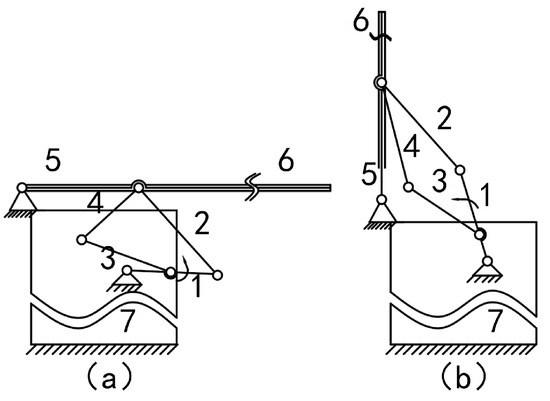 Schematic of the motion of the lifting mechanism: 1. drive rod; 2. lift rod; 3. drive auxiliary rod; 4. lift auxiliary rod; 5. leg placing plate; 6. slide plate; 7. bracket; (a) horizontal state; (b) vertical state.