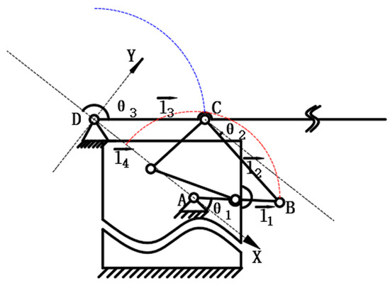 As shown in Figure 4, the driving rod of the key components of the leg lifting mechanism AB is , the lifting rod BC is , the leg placing plate DC is , and the fixing point AD is The coordinate system as shown in the figure is established, with the X-axis forward as the starting point of the rotation angles ,, and of each component and the positive direction as the counterclockwise direction. Each component is expressed as a vector form, and the vector equation of the leg lifting mechanism can be obtained, namely