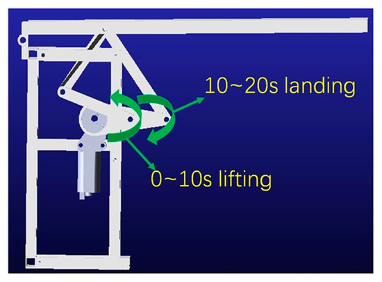 As shown in Figure 17a, the peak displacement of the center of mass of the lifting rod in the vertical and horizontal directions differs from the initial value by approximately 138 mm and 197 mm, respectively. This indicates that the motion range of the lifting rod meets the design requirements of the lifting mechanism. A–H in Figure 17b represent the variation in the angular velocity of the lifting rod during a complete lifting and landing cycle. The maximum angular velocity is 4.18 deg/s, and the angular velocity change process is relatively stable. Additionally, a–h in Figure 17c illustrate the variation in the angular acceleration of the lifting rod during the full lifting and landing cycle. The maximum angular acceleration is 5.68 deg/s2, and the change process of angular acceleration is relatively stable. By analyzing the displacement, angular velocity, and angular acceleration curves of the lifting rod in Figure 17, it is evident that the motion performance of the lifting rod is satisfactory and meets the design specifications.