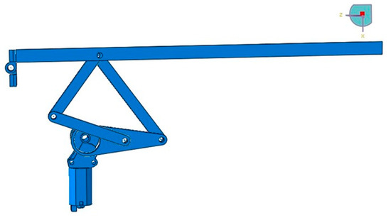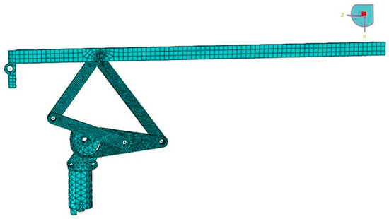 The mesh division should be based on the structural characteristics of the analysis object and practical problems to choose the appropriate element type. The finite element includes a solid element, shell element, beam element, volume element, and other element types. Since the analysis of the leg lifting mechanism has been simplified, and we hope to obtain a more real situation, the solid element is therefore used in this analysis. The unit type is C3D8R, an eight-node hexahedron linear reduction integral element. The mesh division of the mechanism is shown in Figure 8.