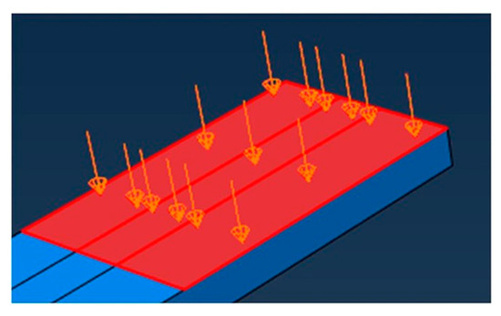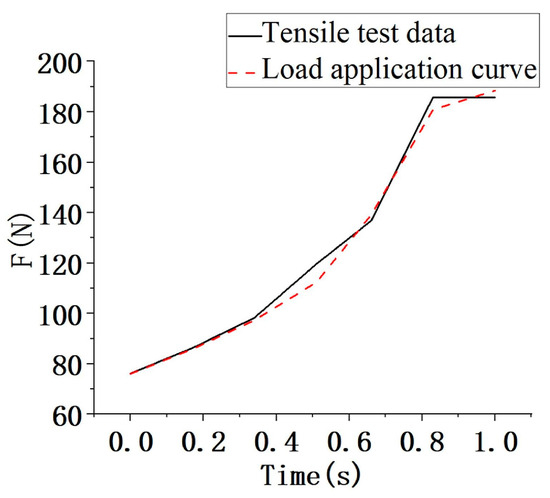 Combined with the test results of force changes during the leg lifting action, the test results were set as the amplitude curve and applied to the front end of the leg placing plate. In the process of the leg lifting force experiment, it was found that the heel and the front end of the calf tend to press down during the leg lifting process. At the same time, the digital tension meter is also fixed at the front end of the leg. Therefore, in order to conform to the actual scene, the action range of the force is applied to the front end of the leg placement plate for about 200 mm. The application method is shown in Figure 9.