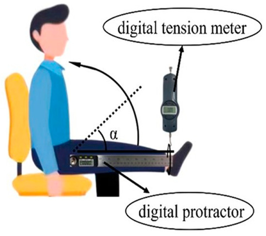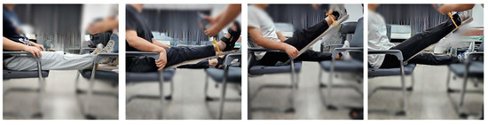 The test subjects were seated on designated chairs. During the experiment, the leg was fixed with soft rope and a wooden board, and the wooden board was firmly fixed at the lower end of the leg of the experimental object to prevent knee bending during the leg lifting process from affecting the test results. A digital tension meter was attached at the front end of the legs. During the process, the test operator holds the tension meter firmly while lifting the subjects’ legs, ensuring that the tension meter remains perpendicular to the legs. An assistant uses a digital display protractor to measure the leg lifting angle, denoted as α, and records the test data. A schematic of the test setup is shown in Figure 10. In this study, a total of 20 volunteers participated in the experiment. The average age of the participants was 27.6 years old, and the standard deviation was 9.02. All participants were healthy. The experiment was repeated at different times to ensure the reliability of the data. Specifically, each group of experiments carried out 3–5 repeated measurements in the early morning, before and after a lunch break, and before and after physical exercise, and between each experiment, 15–30 min of rest was arranged for the experimental subjects to ensure the accuracy and independence of each measurement data. Four groups of experimental models are shown in Figure 11.