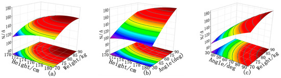 Using the response surface experimental data and software analysis, response surfaces and contour plots were created to visualize the interactions among various factors [28]. The results are shown in Figure 14. As shown in Figure 14a, the leg force increases with both height and weight. The weight curve is steeper than the height curve, indicating a stronger influence of weight on leg force. The response surface is steeper, and the contour lines are denser, suggesting a significant interaction between height and weight affecting leg force. As shown in Figure 14b, leg force increases with the lifting angle, while the change with height is minimal. The angle curve is steeper, indicating a stronger influence of the lifting angle on leg force. The response surface is steeper, and the contour lines are denser, highlighting a significant interaction between height and the angle of leg force. As shown in Figure 14c, leg force increases with both weight and angle. The angle curve is steeper than the weight curve, indicating that the angle has a greater impact on leg force. The response surface is steeper, and the contour lines are denser, suggesting a significant interaction between angle and weight on leg force.
