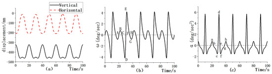 Motion simulation curve of the driving rod: (a) displacement curve; (b) angular velocity curve; (c) angular acceleration curve.