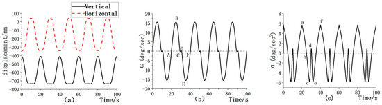 Motion simulation curve of the lifting rod: (a) displacement curve; (b) angular velocity curve; (c) angular acceleration curve.