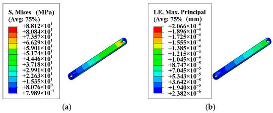 The simulation results of the lifting rod are shown in Figure 20. According to the equivalent stress cloud diagram and strain cloud diagram, it can be seen that the maximum stress of the lifting rod under this force condition is 88.12 MPa and the maximum strain is 2.066 × 10−4 mm. According to the GB/T 699-2015 standard, the tensile strength of 45 steel is 600 MPa and the yield strength is 355 MPa, while the maximum stress of the lifting rod is less than the yield strength of 45 steel, so the strength and stiffness of the lifting rod meet the design requirements.