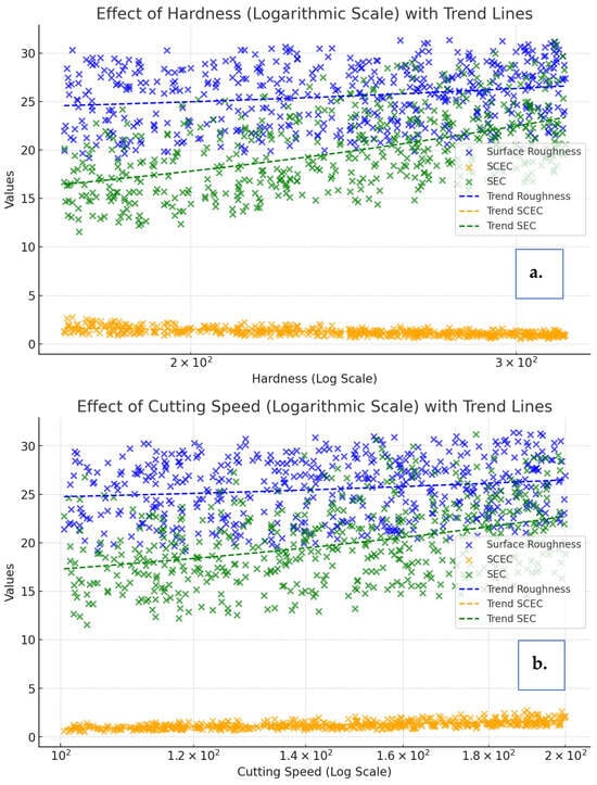 In this analysis, Python programming language was utilized along with the libraries Python 3.13—Matplotlib NumPy and SciPy. Plotly and Matplotlib were employed for data visualization, while NumPy facilitated numerical computations. Additionally, SciPy’s linregress function was applied to generate trend lines and examine the relationships between variables. The study incorporated a logarithmic scale to address disparities in magnitude between variables in Figure 5. For instance, feed rate values were significantly smaller compared to energy consumption metrics such as SEC (Specific Energy Consumption, Wh/mL) and SCEC (Specific Cutting Energy Consumption, Wh/mL). Using a logarithmic approach allowed for a more balanced and accurate visualization of the correlations. Throughout the process, 500 iterations were conducted to optimize the parameters and minimize the metrics of surface roughness (Ra), SEC (Wh/mL), and SCEC (Wh/mL). Figure 5a illustrates the interplay between hardness and the metrics of interest, revealing critical insights. As hardness increases, surface roughness (Ra) decreases significantly due to the reduced deformation of harder materials during machining, which enhances surface quality. For instance, at a hardness value of 170, the surface roughness measures approximately 35 μm, while at 320, it reduces to around 20 μm. This trend aligns with the observed reduction in SCEC (Wh/mL), which drops from 1.5 Wh/mL at 170 hardness to 0.8 Wh/mL at 320. A similar pattern emerges for SEC (Wh/mL), demonstrating an improvement in energy efficiency, with values declining from 35 Wh/mL at 170 hardness to 15 Wh/mL at 320. These findings highlight the advantages of using harder materials to achieve both superior surface quality and energy efficiency.