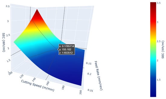 The graph presents the effects of cutting speed and feed rate on SEC in a nonlinear structure. Medium-level combinations of cutting speed and feed rate help balance SEC, while extreme values (high cutting speed and high feed rate) lead to higher energy consumption.