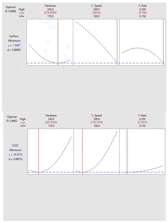 RSM Optimizer was used to determine the optimal levels, and the results are shown in Figure 11. The identified parameters provide an effective roadmap for optimizing both surface quality and energy consumption.