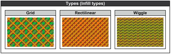 - The Type parameter expresses the type of Infill geometry. In this study, the types used were Grid, Rectilinear, and Wiggle.