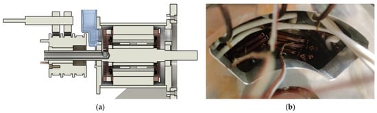 Overview of the test machine [18]: (a) Longitudinal cross-section of the electric machine. From left to right: slip-ring system, cooling system inlet interface (blue highlighted), test machine, and mounting flange. (b) The outlet of the test machine makes visible both the rotor windings and the placed thermocouples.