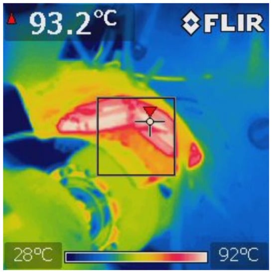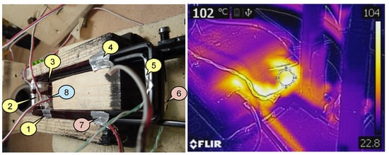 Thermal imaging based on emitted infrared radiation is a powerful tool for immediate non-contact temperature distribution evaluation. Figure 2 demonstrates the temperature distribution seen by IR camera Flir i7, by FLIR Systems, Inc. (Bradenton, FL, USA) whereas the temperature readings from the thermocouples (seen in Figure 1) are 83.8 °C and 73.7 °C, respectively. A significant temperature difference is not unusual, given the spherical measuring head of the temperature sensor, which has a diameter of about 1–2 mm, the contact thermal resistance between the sensor and the coil, and the location of the sensor in an intensively cooled environment.