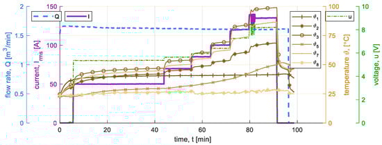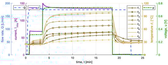 One of the thermal test graphs is presented in Figure 3, where the values of the excitation current are 50, 70, 85, 100, 120, and 135 A, the coolant flow rate is Qin = 1.62 m3/min, and similarly to the result of the IR camera (Figure 2), the values of the temperature sensor after the end of the transition process of a short time constant are ϑ3 = 83.8 °C and ϑ7 = 73.7 °C, respectively. Temperature sensor ϑ2 measures the coolant outlet and ϑ1 inlet temperatures. Sensor ϑ8 is connected to the machine housing and ϑ5 to the slip-ring system.