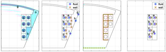 It is anticipated that simplifications of the geometry are key to the successful modeling of conjugate heat transfer (Figure 4), which would allow focusing on the distribution of the cooling flow and the resulting temperature distribution. Thus, the modeling of thermal resistance, which would require a detailed geometric model or an adequate interface thermal resistance model, is deliberately neglected. The coolant flow is divided between circular and non-circular channels (Figure 4, leftmost), where Table 3 gives their geometric and hydraulic parameters. All interfaces between solids and liquids are subject to heat transfer (Figure 4, geometry contours), where the fluid and wall data are collected from numerical field calculations according to the specified geometric location (Figure 4, middle-left). In addition to the forced cooling interfaces, other important interfaces are the inter-turn thermal (conduction) resistance between conductors (selected turn-to-turn conductance 10 W/(m2 K) and the internal unforced cooling surfaces, which is determined by the natural cooling (Figure 4, middle-right). In parallel, a symmetrical half-rotor pole model is compared with a wind tunnel model that uses the same hollow conductor coil but with a different background geometry (Figure 4, rightmost).