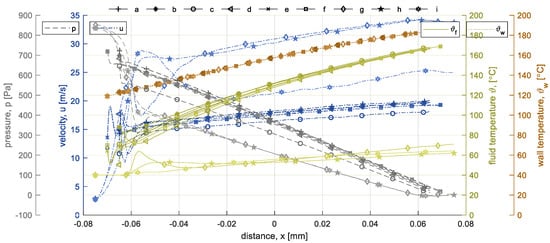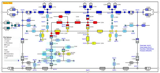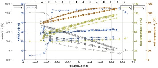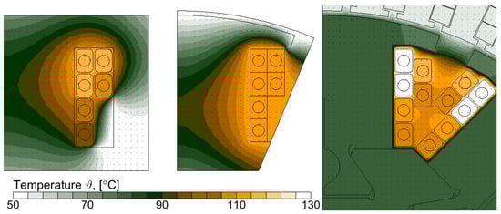 The calculation results do not include the previously demonstrated test point (Figure 2 and Figure 3), as it was performed with a higher cooling flow than the model was able to successfully calculate. By visual assessment, it can be assumed that the highest temperature of the coil with the same heat losses is below 100 °C and the outlet temperature is about 80 °C, while the inlet temperature is 40 °C. If the highest model-based temperature of the coil is to be estimated with that of the infrared camera, then with the given accuracy, the subsequent result could be considered rather as expected. The comparison of the remaining measured and modeled temperature points is interesting because the temperature space distribution in both the cooling channel and the outlet is scattered.