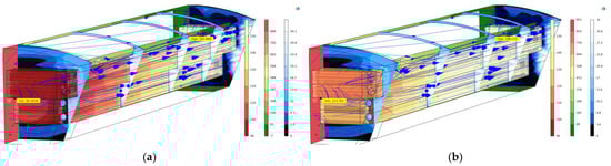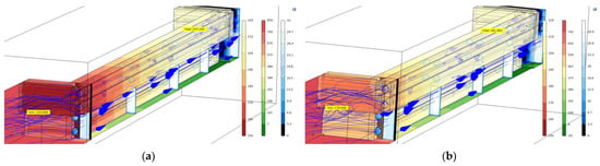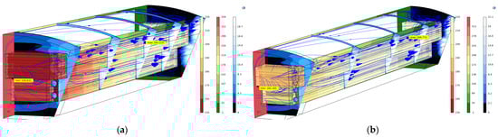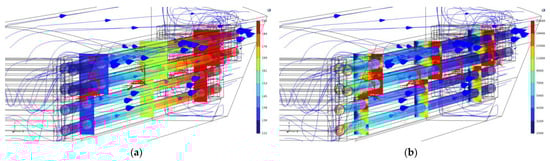 Half of the rotor pole. The color bars show the velocity, pressure, and temperature distribution along the rotor winding at Qin = 1.36 m3/min (170 L/min per coil) and Prcu = 1.39 kW: (a) inlet temperature ϑin = 20 °C (J = 20.2 A/mm2); (b) inlet temperature ϑin = 40 °C (J = 19.6 A/mm2).
