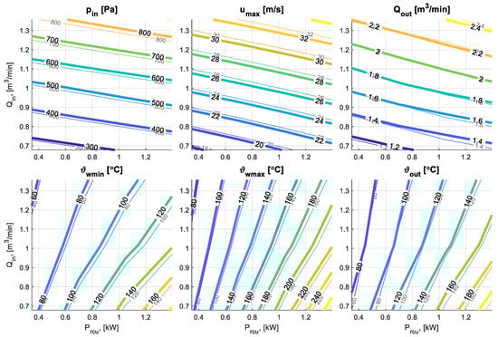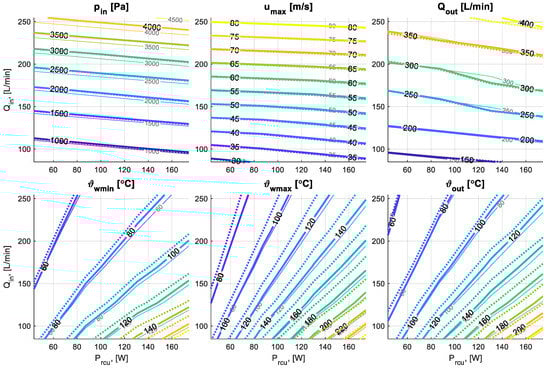 Average outlet flow rate (Qout), inlet pressure (pin), maximum flow velocity in the cooling ducts (umax), average outlet temperature (ϑout), minimum (ϑwmin) and maximum coil temperature (ϑwmax) as a function of heating power (Prcu), and inlet flow rate (Qin). The inlet temperatures are 20 °C and 40 °C, shown by thin and thick contour lines, respectively.