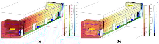 Half of the rotor pole. The color bars show the velocity, pressure and temperature distribution along the rotor winding Qin = 0.68 m3/min (85 L/min per coil) and Prcu = 1.39 kW: (a) inlet temperature ϑin = 20 °C (J = 18.5 A/mm2); (b) inlet temperature ϑin = 40 °C (J = 17.9 A/mm2).