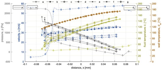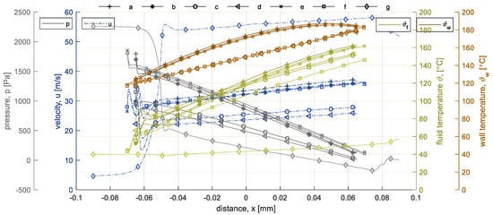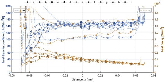 Based on the 3D FE CHT calculation data of the cooling channels, the calculation results of the heat transfer coefficient and heat flow are presented (Figure 18 and Figure 19). Channel i data is not shown because it is outside the plot of the image, where the average heat transfer coefficient is 735 W/(m2 K) and the heat flow is 72 kW/m2.