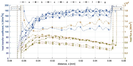 Distribution heat transfer coefficient and heat flux along the cooling channels (Figure 4) in the rotor pole model without thermal resistance between the turns.