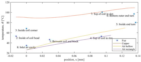 A lumped parameter thermal network (LPTN) is a simplified thermal circuit that allows a quick overview of the relationship between the temperature points of interest at different heat losses and cooling efforts. Since the thermal resistances between the points are assumed to be known, they are either measured experimentally or defined by calculation. In the case of a sufficient number of temperature measurement points, it is possible to define inter-point relations such as heat transfer coefficients for the LPTN describing the experiment, and in their absence, it is possible to rely on the CHT calculation. The LPTN temperature measurement estimate of the aggregate parameters is shown in Figure 20. As mentioned earlier, combined heating and cooling temperature measurement involves a challenge, where the thermocouple measurement result needs to be interpreted correctly depending on the actual sensor placement. Therefore, the LPTN model has been used to assess the accuracy of the measurement results based on known experimental data. This comparison suggests that some or most of the thermocouple sensors in the wind tunnel test do not accurately measure the winding temperatures. It is possible that the sensor head is cooled by the air flow to various degrees. The sensor positions are shown in Figure 9.