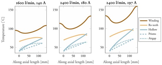 Temperature distribution along the rotor coil, rotor teeth, and cooling channels at 1600 L/min and 140 A and 2400 L/min at 180 A and 197 A (J = 22.5A/mm2), respectively.