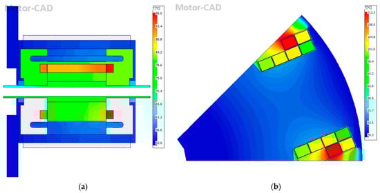 Temperature distribution: (a) axial 2D FEA; (b) rotor pole radial FEA.