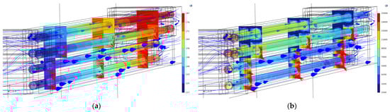 Compared with the rotor model where the thermal resistance is zero, the average temperature of the cooling medium is 5.1–5.8 degrees warmer, and the temperature of the electric conductor in the core is 6.2–7.2 degrees warmer than when the thermal resistance is 10. It is assumed that the temperatures of coils a and b are higher, and the heat exchange is less, but this is not the case. The flow rate is 0.5–0.6% higher when the thermal resistance is 0, and the largest change in the average heat transfer coefficient is 9.6%, 2.8%, and 1.2% for channels d, e, and f, respectively. The conductors c, d, e, and f are double-sided cooling—internal cooling in a circular channel and external cooling in a flat channel between the coils.