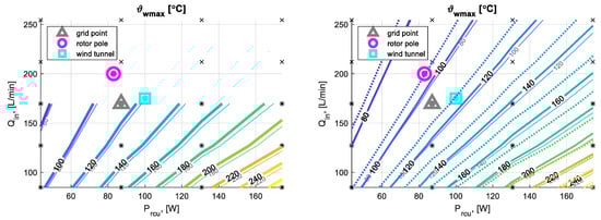 A brief overview of the calculations and measurements of the maximum temperature of the rotor coil (calculation points shown with *). On the left is the contour map of the rotor coil model, and on the right is the wind tunnel (calculation points shown with x).