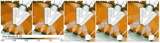 Flux density distribution at 120, 140, 160, 180, and 200 A of excitation current.