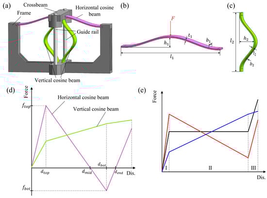 The vibration isolation structure diagram and its theoretical analysis: (a) The schematic diagram of the vibration isolation structure. (b) The parameters of the horizontal cosine beam. (c) The parameters of the vertical cosine beam. (d) The force–displacement curve of the horizontal cosine beam and the vertical cosine beam. (e) The force–displacement curve of the vibration isolator.