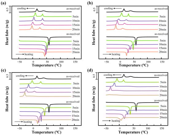 As shown in Figure 2a,b, at temperatures of 450 °C and 470 °C, the DSC cooling curves for NiTi alloys exhibit two transformation peaks, namely, the R-phase and martensitic (M) transformation, corresponding to the two-step martensitic transformation (A→R→M). The heating curve exhibits a single peak, which corresponds to the reverse martensitic transformation M→A. As shown in Figure 2c,d, at temperatures of 490 °C and 510 °C, the two peaks on the cooling curve merge with increasing holding time, reflecting an A→R→M/A→M process. This transition occurs as heat treatment time increases, the R phase in the alloy turns into the M phase, making the phase transition more stable. Consequently, the phase transformation type undergoes a gradual transition from A→R→M to A→M as the duration of the heat treatment increases.