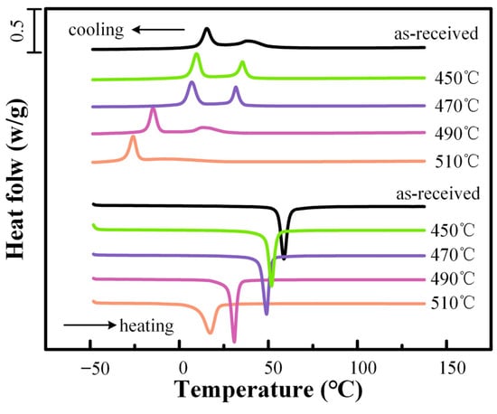 As shown in Figure 3, the heat treatment temperature significantly affects the phase transformation type of NiTi alloys. At treatment temperatures of 450 °C, 470 °C, and 490 °C, the DSC cooling curves exhibit two-phase transition peaks, corresponding to the two-step martensitic transformation (A→R→M). When the temperature reaches 510 °C, a single peak emerges, indicative of a one-step martensitic transformation (A→M). For all heat treatment temperatures, the DSC heating curves show a single peak, corresponding to the reverse martensitic transformation (M→A), where the R-phase has fully transformed into the M-phase. The phase transformation behavior of NiTi alloys differs during heating and cooling cycles. During heating, only a single peak corresponding to the reverse martensitic transformation (M→A) is observed. However, during cooling, two peaks appear, corresponding to the A→R→M phase transformation sequence. This difference arises due to the distinct mechanisms at play during heating and cooling. The formation of the R-phase during cooling is a consequence of the intermediate phase between martensite and austenite, which stabilizes under cooling conditions, while the reverse transition from martensite to austenite occurs as a single step during heating.
