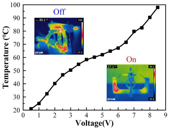 A DC power supply (Mastech DP6020, Shenzhen Ouruijia Technology Co., Ltd., Shenzhen, China) is used to heat the NiTi alloy vibration isolation structure under a constant current of 6 A to investigate the influence of voltage on temperature. We use a temperature sensor (WZPK-100, Hangzhou Meaco Sensor Technology Co., Ltd., Hangzhou, China) and an infrared thermal imager (FLIR E40, Shenzhen Yida Intelligent Technology Co., Ltd., Shenzhen, China) to measure the temperatures of the vibration isolation structure at different voltages.