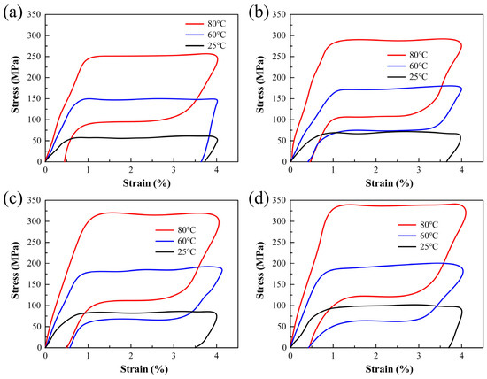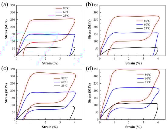 With a heat treatment holding time of 10 min, the heat treatment temperatures are set at 450 °C, 470 °C, 490 °C, and 510 °C to investigate their effects on the mechanical properties of NiTi alloys, as shown in Figure 7. Figure 7a,b illustrate the effects of heat treatment temperatures of 450 °C and 470 °C on the NiTi alloy. As the testing temperature increases from 25 °C to 60 °C, the alloy transitions from shape memory behavior to a memory-superelastic composite behavior. At 80 °C, the alloy exhibits superelasticity, with its performance predominantly governed by the austenite phase. Therefore, the increase in the austenite phase with increasing heat treatment temperature leads to the transformation of the shape memory behavior into superelastic behavior in the alloy.