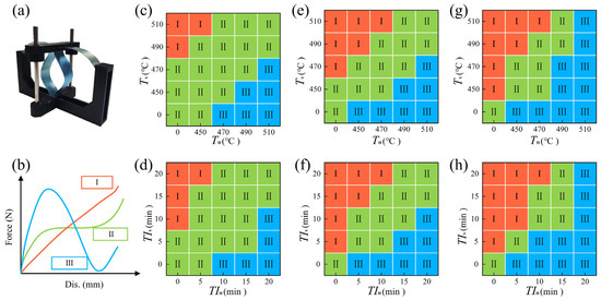 The influence of heat treatment conditions of horizontal and vertical cosine beams on structural stiffness performance: (a) The physical diagram of the vibration isolation structure. (b) The three stiffness modes of vibration isolation structure, I, positive stiffness, II, zero stiffness, III, negative stiffness. At 5 min heat treatment time, the effect of heat treatment temperature for horizontal and vertical cosine beams on the stiffness of vibration isolation structures with test temperatures of (c) 25 °C, (e) 40 °C, and (g) 80 °C. At 450 °C heat treatment temperature, the effect of heat treatment time for horizontal and vertical cosine beams on the stiffness of vibration isolation structures with test temperatures of (d) 25 °C, (f) 40 °C, and (h) 80 °C.