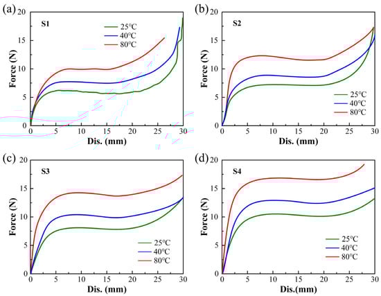As illustrated in Figure 9, the stiffness characteristics of the vibration isolation structures exhibit notable differences under varying test temperatures. The results of the static compression test demonstrate that when the temperature is 25 °C, 40 °C, and 80 °C, the quasi-zero stiffness reaction/peak forces of S1 are approximately 5.5 N, 7.5 N, and 10 N, respectively (Figure 9a). In the quasi-zero stiffness range of S2, the reaction force/peak force is approximately 7 N, 8.5 N, and 12 N at 25 °C, 40 °C, and 80 °C, as illustrated in Figure 9b. Figure 9c illustrates that the quasi-zero stiffness reaction force/peak force of S3 is approximately 8 N, 10 N, and 13.5 N at 25 °C, 40 °C, and 80 °C, respectively. Figure 9d depicts that the quasi-zero stiffness reaction force/peak force of S4 is approximately 10 N, 12.5 N, and 16.5 N at 25 °C, 40 °C, and 80 °C.