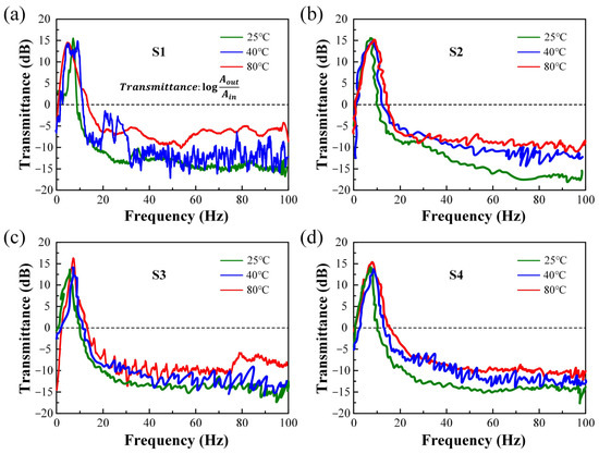 The transmissibility curve of the vibration isolation structure at different temperatures (25 °C, 40 °C, 80 °C): (a) S1. (b) S2. (c) S3. (d) S4.