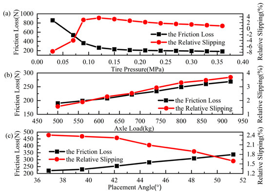 | Testing Vehicle | Front Axle Load/kg | Placement Angle/° | Relative Slipping/% | Calculated Values of Friction Loss/N | Measured Values of Friction Loss/N | Relative Error/% |