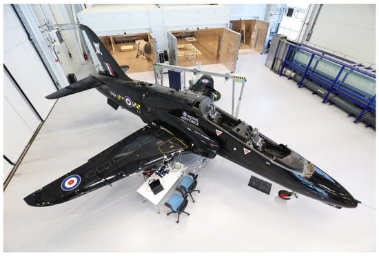 This paper uses a public dataset generated from a decommissioned British Aerospace Electronics systems Hawk T1A aircraft, previously used by British Royal Air Force for training and donated to University of Sheffield by the Defense Science and Technology Laboratory [14,15]. As showcased in photo of the aircraft in Figure 1 housed at Laboratory for Verification and Validation, the airframe is largely undamaged, but the engine, some flaps, the canopy, and other parts have been removed, while the aircraft rests on its wheels. The wheels were flattened to avoid unintended movement and to ensure stability during testing and data collection.