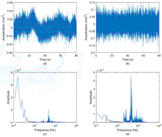 Visualization of healthy and damaged states from sensor 16 in time and frequency domains: (a) healthy state in the time domain; (b) damaged state in the time domain; (c) healthy state in the frequency domain; (d) damaged state in the frequency domain.