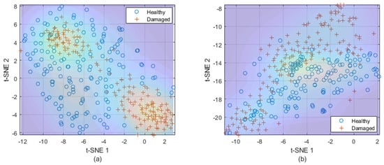 t-SNE distributions of the studied data scatters: (a) 2-dimensional t-SNE; (b) 2nd-degree polynomial mapping of t-SNE.