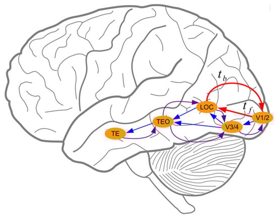 Figure 5, in this case, provides a compelling visual representation of the interplay between feedforward and feedback processing in the primate cortical object pathway. The diagram highlights key regions involved in shape perception, including V1/V2 (early visual areas); V3/4 (mid-level visual areas); Lateral Occipital Complex (LOC), responsible for object recognition; and higher-level areas such as Temporal Cortex (TE) and Temporal–Occipital area (TEO). These regions are connected via feedforward () and feedback () pathways, forming a recurrent circuit that supports the rapid integration of shape information.