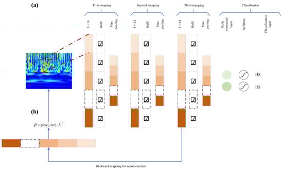 As addressed in Figure 6, CNN-RM architecture is composed of several layers organized as described in three mapping steps. The input layer accepts grayscale images of size 16 × 16 × 1. This is followed by three convolutional layers with 16, 32, and 64 filters, respectively. Each convolutional layer is followed by ReLU activation functions and max-pooling layers to reduce the spatial dimensions of the data. After these convolutional layers, a fully connected layer is used, which connects to the output layer through a softmax function that classifies the images into different categories. The final output of the network is the predicted class of the input image. The Bayesian optimization method is employed to fine-tune the hyperparameters of the CNN [26]. This includes optimizing the learning rate, maximum epochs, mini-batch size, and L2 regularization. The optimization process involves an objective function that seeks to maximize the mean of all classification metrics, which is based on accuracy, F1 score, precision and recall, while minimizing the Root Mean Square Error in image reconstruction during Reversed Mapping (). The goal is to balance classification accuracy and trustworthiness of results and circumvent vanishing of meaningful real representations in original images. Once the hyperparameters are optimized, the model undergoes training using the selected best parameters. The training process uses Stochastic Gradient Descent With Momentum (SGDM) and is based on the chosen learning rate, mini-batch size, number of epochs, and L2 regularization [28]. After training, the model is evaluated on both the training and testing datasets.