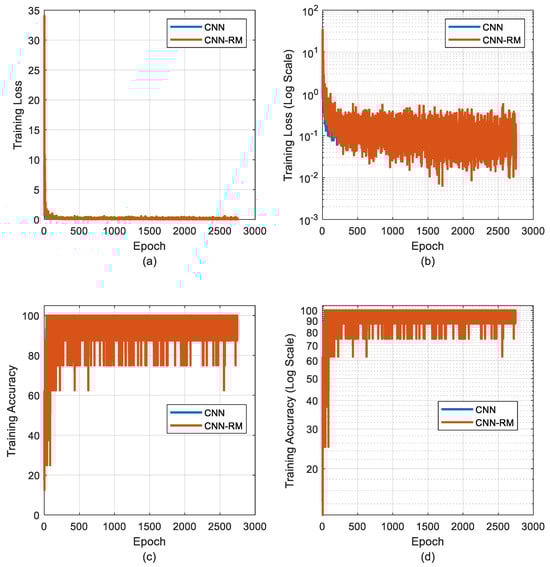 Loss function behavior of CNN and CNN-RM: (a) standard loss function with the original scale; (b) loss function on a logarithmic scale; (c) standard training accuracy with the original scale; (d) training accuracy on a logarithmic scale.