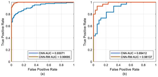 Figure 8 presents Area Under Curve (AUC) and Receiver Operating Characteristic (ROC) curves for both CNN and CNN-RM models, evaluated on both training and testing datasets [31]. The CNN-RM model outperforms the CNN model in terms of AUC for both datasets. Specifically, the CNN model demonstrates an AUC of 0.9307 on the training set and 0.8941 on the testing set, whereas the CNN-RM model achieves an AUC of 0.9970 on the training set and 0.9814 on the testing set. This indicates that the CNN model exhibits substantial misclassifications compared to the CNN-RM model. This discrepancy is primarily due to the fact that AUC evaluates a model’s ability to correctly rank predictions across various thresholds [31]. A higher AUC reflects better ranking performance, even when the model faces misclassifications. The CNN model may be overfitting the training data, which hampers its ability to generalize and negatively impacts its performance on the testing set. Additionally, the misclassifications may be aggravated by an inappropriate classification threshold. In contrast, the CNN-RM model benefits from its feedback mechanism, which fine-tunes decision boundaries and improves classification accuracy by correctly identifying previously misclassified samples. As a result, while the CNN-RM model achieves a higher AUC than the CNN model, it also demonstrates superior performance in terms of classification accuracy, precision, and recall, thus highlighting the trade-off between ranking ability (i.e., AUC) and actual classification performance.